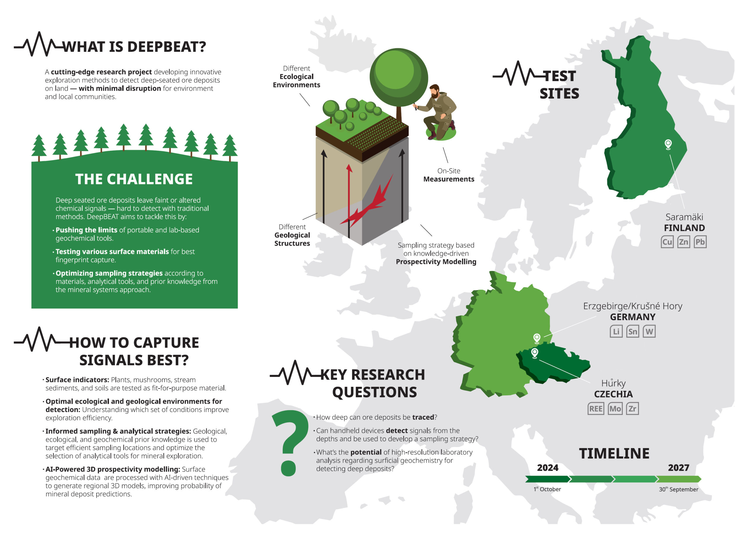 The discovery of deep deposits by surface methods is challenged by the distance from the surface to the mineralization as a source of a geochemical signal. DeepBEAT is a Horizon Europe funded project to advance geochemical methods for the identification of deep-seated mineral deposits, propelling Europe to the forefront of scientific innovation in the field. The aim of the project is to develop interdisciplinary, holistic, and sustainable exploration approach that combines deep geochemical knowledge to geophysics and social aspects. DeepBEAT will provide tools to comprehensively map available resources, facilitating informed planning for sustainable exploration practices aligned with the goals of responsible resource management. Recognizing the crucial role of public support, DeepBEAT is dedicated to promoting awareness, aiming to engage scientists, exploration and mining companies, and stakeholders in meaningful interactions with the public.